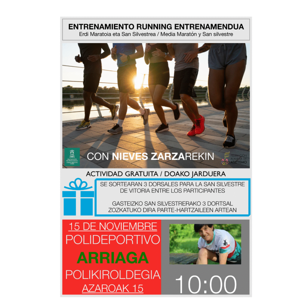 El sábado 15 de noviembre celebraremos un entrenamiento en el polideportivo Arriaga (10:00 horas) con la atleta Nieves Zarza como preparación para la Media maratón y la San Silvestre